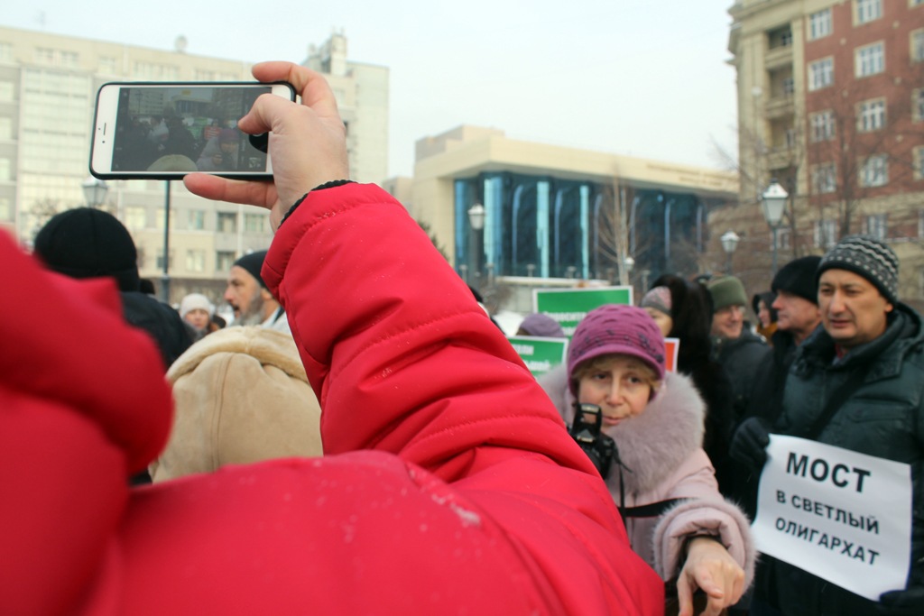 На плакатах значилось: «Хватить грабить новосибирцев», «Элита — в доле, народ против», «Травников! Подписать концессию — сдать Новосибирскую область в рабство», «Мост в светлый олигархат».
