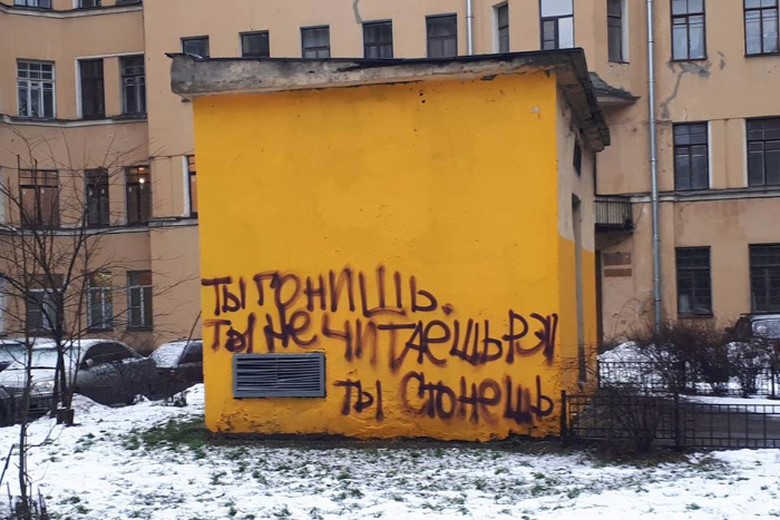 На этот раз граффити всё-таки закрасили. Судя по фотографиям из соцсетей, поверх желтой краски появилась надпись «Ты гонишь. Ты не читаешь рэп, ты стонешь».