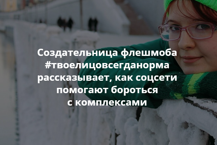 В начале декабря петербурженки, известные в соцсетях как Оли Коксон и Катя Весна, запустили в инстаграме флешмоб #твоелицовсегданорма. Девушки призывали выкладывать свои фотографии, которые не соответствуют общепринятым нормам красоты. На момент выпуска материала момент во флешмобе приняли участие более 2700 человек.