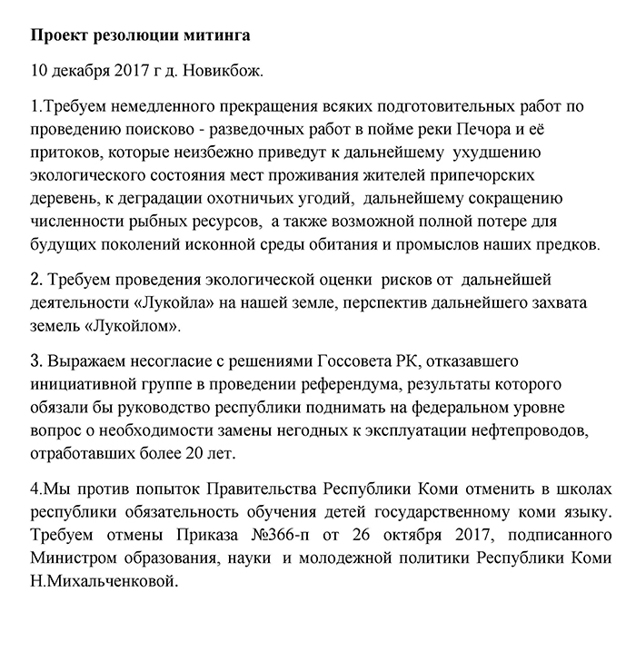 Митингующие в Новикбоже и Усть-Усе единогласно проголосовали за резолюцию, в которой потребовали прекращения поисково-разведочных работ в пойме Печоры, проведения экологической оценки рисков от действий нефтедобывающих компаний, а также высказались против отказа Госсовета Коми провести референдум о замене старых нефтепроводов и попыток правительства республики отменить обязательное изучение коми языка в школах.