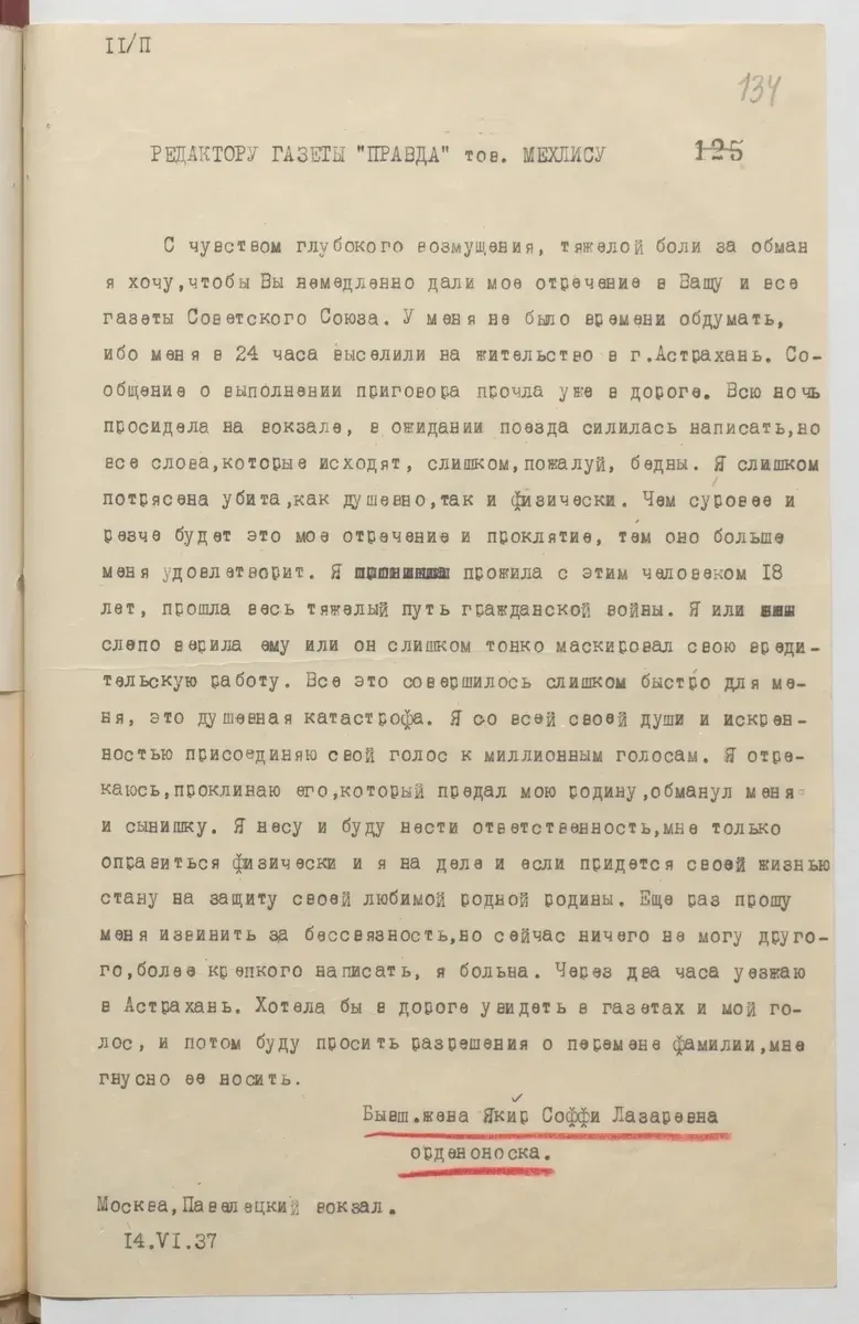 Я отрекаюсь, проклинаю его, который предал мою Родину, обманул меня и сынишку», — говорится в напечатанном на машинке письме жены только что расстрелянного военачальника Ионы Якира Сарры.