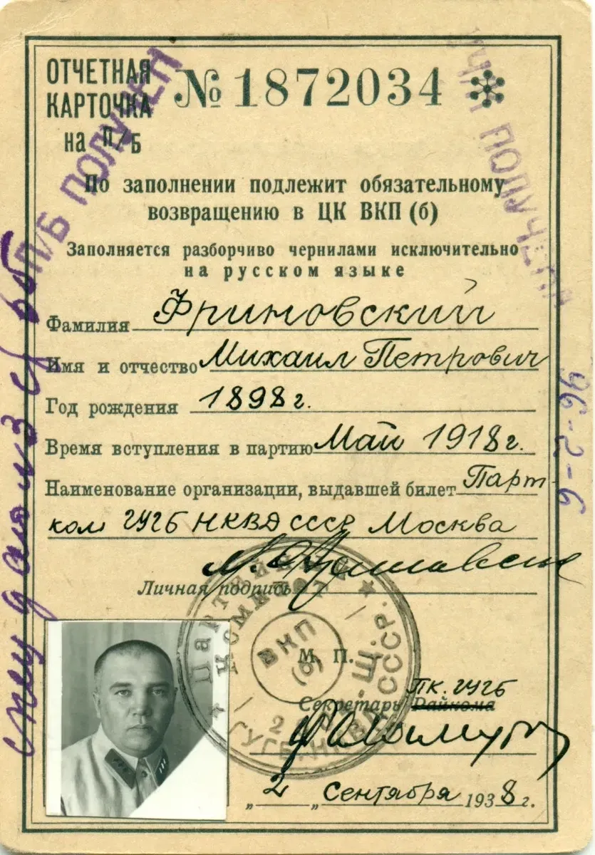 В письме ЦК ВКП(б) Сталину за октябрь 1938 года сообщается, что «за последние два года из центрального (Московского) аппарата НКВД СССР по разным причинам выбыло большое число сотрудников, взамен которых с периферии и по командировкам партийных организаций влились новые товарищи», при этом «дома НКВД обеспечивают только 8% наличного состава — с размещением сотрудников, в настоящее время создалось очень тяжелое положение». Поэтому ЦК просит «передать в распоряжение НКВД СССР 1900 комнат из числа опечатанной в Москве жилищной площади репрессированных», а также «мебель, подлежащую, при наличии судебного решения о конфискации, сдаче в госфонд и находящуюся в опечатанных квартирах». Рядом — партийные карточки сотрудников НКВД Михаила Фриновского, Израиля Дагина, Михаила Литвина — тех, кто сначала станут организаторами, а потом жертвами «большого террора».