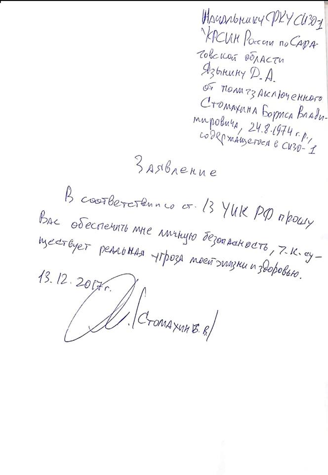 Во время встречи в среду Стомахин рассказал Ростошинской о существующей угрозе его жизни и здоровью. Он уполномочил ее подать начальнику изолятора Дмитрию Язынину свое заявление с требованием перевода в безопасное место и добиться решения вопроса.
