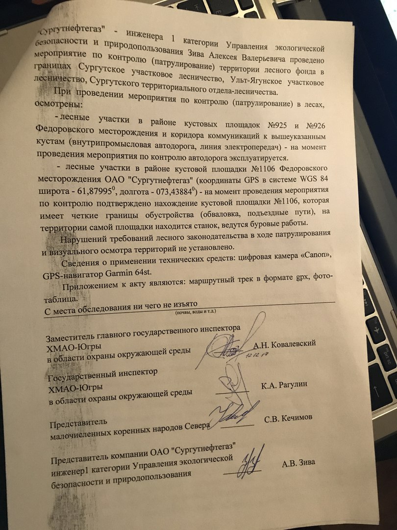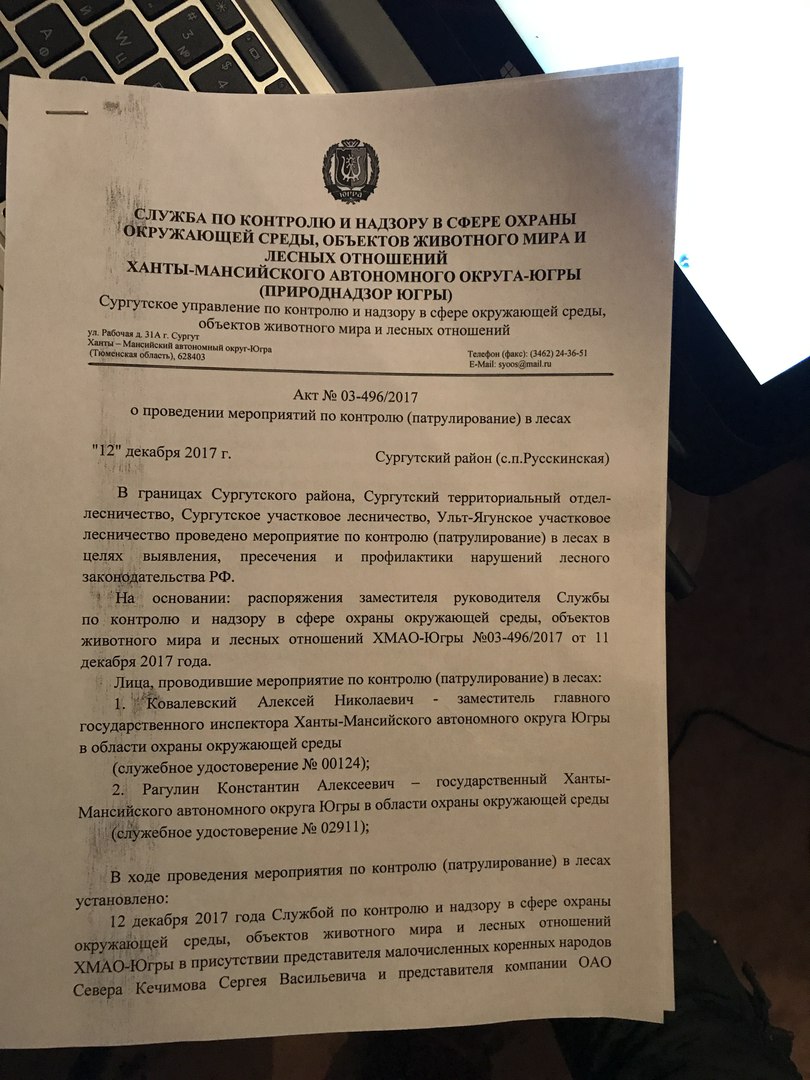 Но в результате мне дали подписать протокол, не дав переводчика на родной язык, и я не имел времени понять содержание, потому что 2 страницы бумаги. Сейчас выяснилось, что они говорили мне на словах, не совпадает с протоколом, а подписывал я с их слов, так как плохо читаю на русском языке. Я говорил про буровую появление которой считаю незаконным, и мне обещали, что поднимут все документы и протоколы и примут решение, а в итоге оказывается, как будто речь шла о лесе и я не имею претензий. Отправил протест в службу по контролю и надзору в сфере охраны окружающей среды, объектов животного мира и лесных отношений, Ханты-Мансийского автономного округа на Акт № 03-496.2017 о проведении мероприятий по контролю (патрулированию) в лесах от 12 декабря 2017сг. Сургутский район (с. Русскинская)