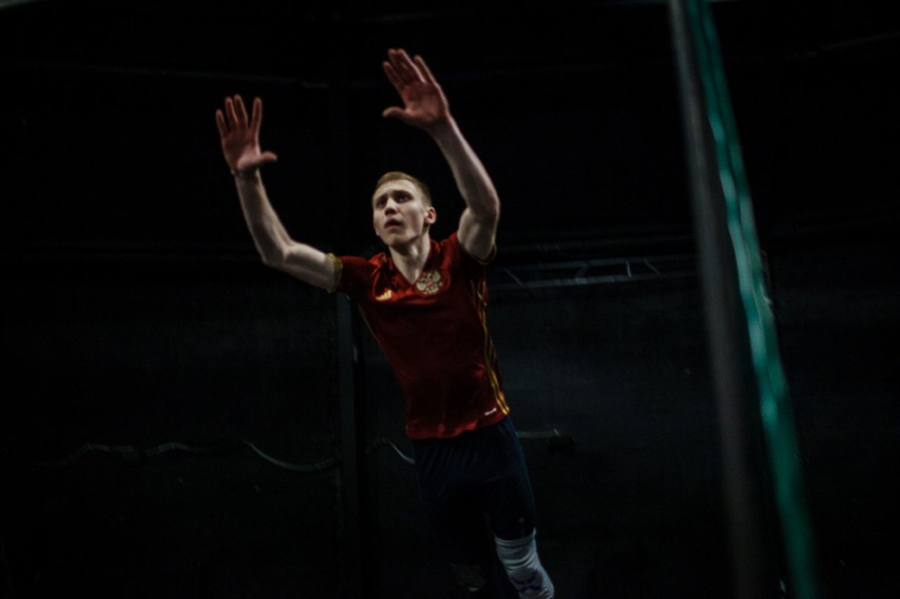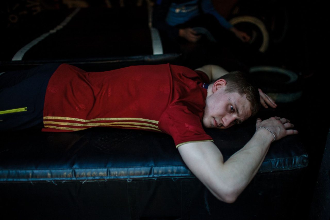 Серега встает под металлическими брусьями. Цепляет кисти за мягкие кольца, раскачивается и взлетает. Делает три полных круга, шпагат в воздухе и опускается на сальто. Серега выглядит как обычный семнадцатилетний задира, но крутится на брусьях, как профессиональный гимнаст.
