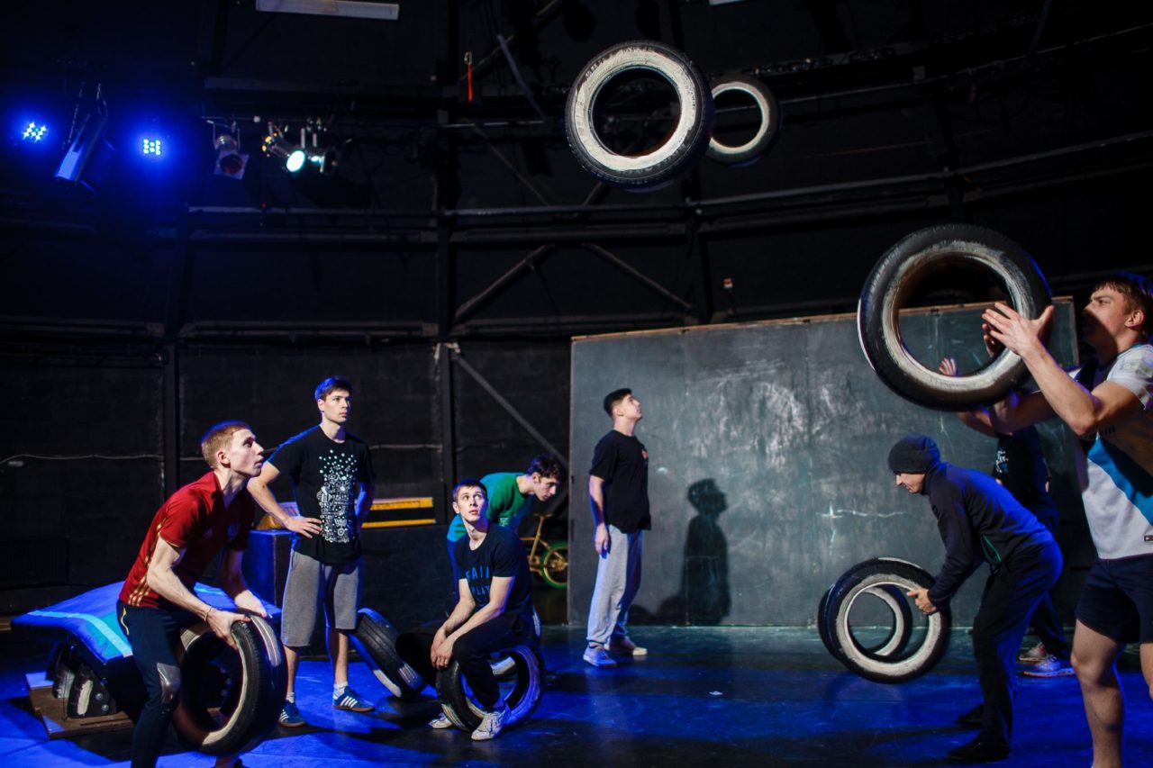 И снова взлетают, крутятся, бьют в барабан и запрыгивают на стены мальчишки всех возрастов. Треугольный купол, софиты, мягкие маты, большой синий шар. Пока старшие встают по обе стороны сцены и перекидывают друг другу тяжелые покрышки, под ними проходят младшие ребята. Это трюк на доверие. В зале напряженная тишина, только гремит музыка: бам, бам, бам! Ребята сбиваются в кучку, и сверху на них рассыпается цветная пыль. Зеленые, синие, оранжевые — счастливые, они стоят перед полным залом и тяжело дышат. В темноте блестят только глаза.