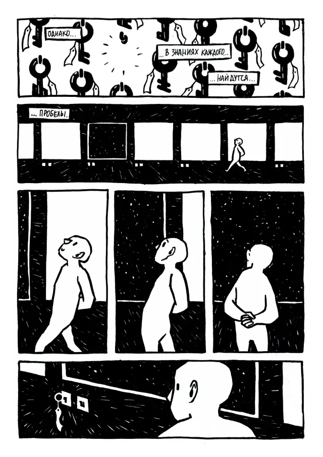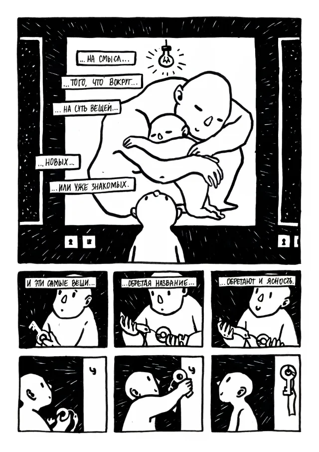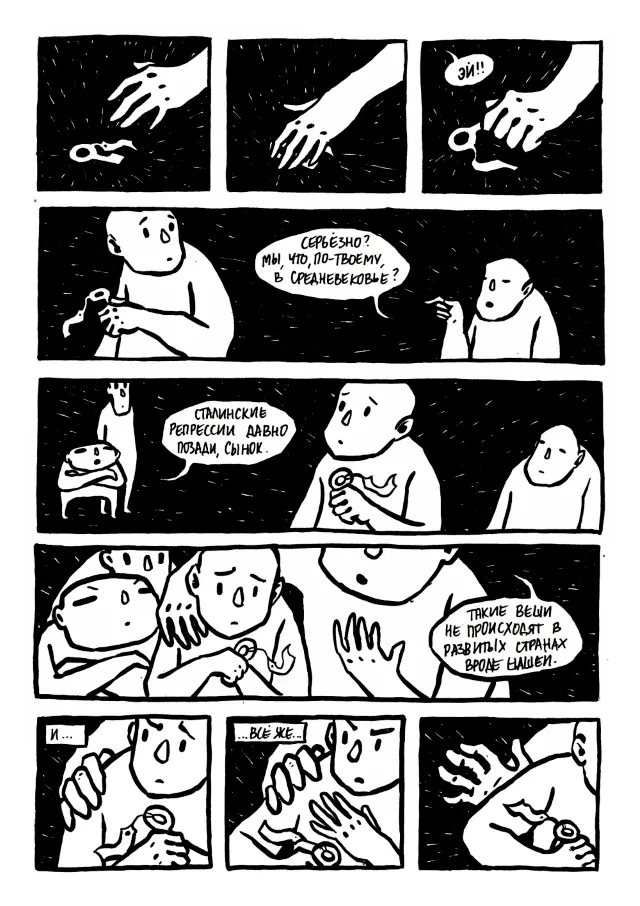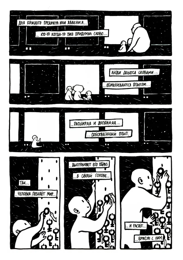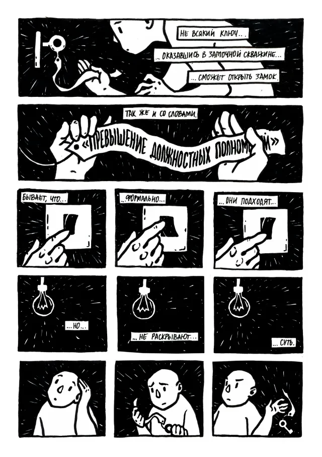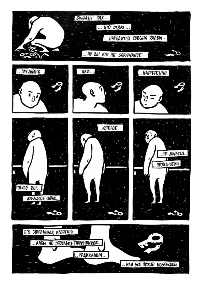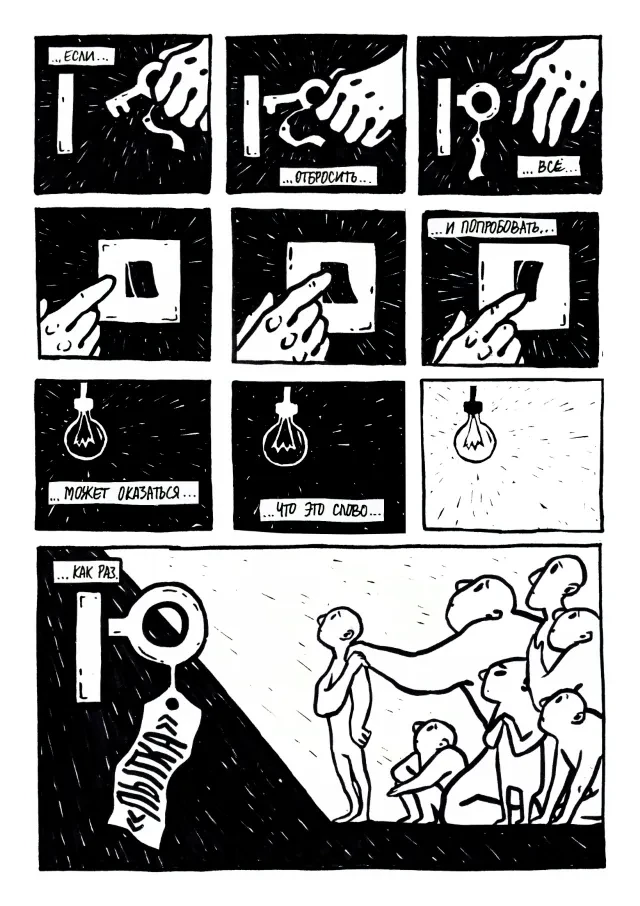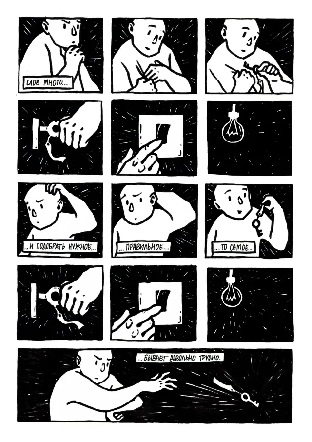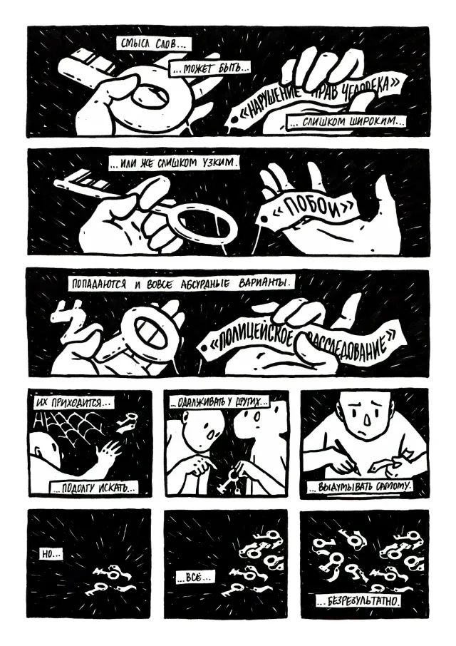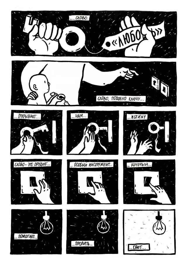 — Я привыкла рисовать что-то из себя и про себя. А тут пришлось общаться с людьми, для которых все мои действия имеют значение. Было трудно подбирать образы и слова. Много раз я перерисовывала, заменяла одно слово на другое. То есть и комикс про слово, и я сама во время работы почувствовала, как от одного слова может меняться смысл того, о чем мы рассказываем.