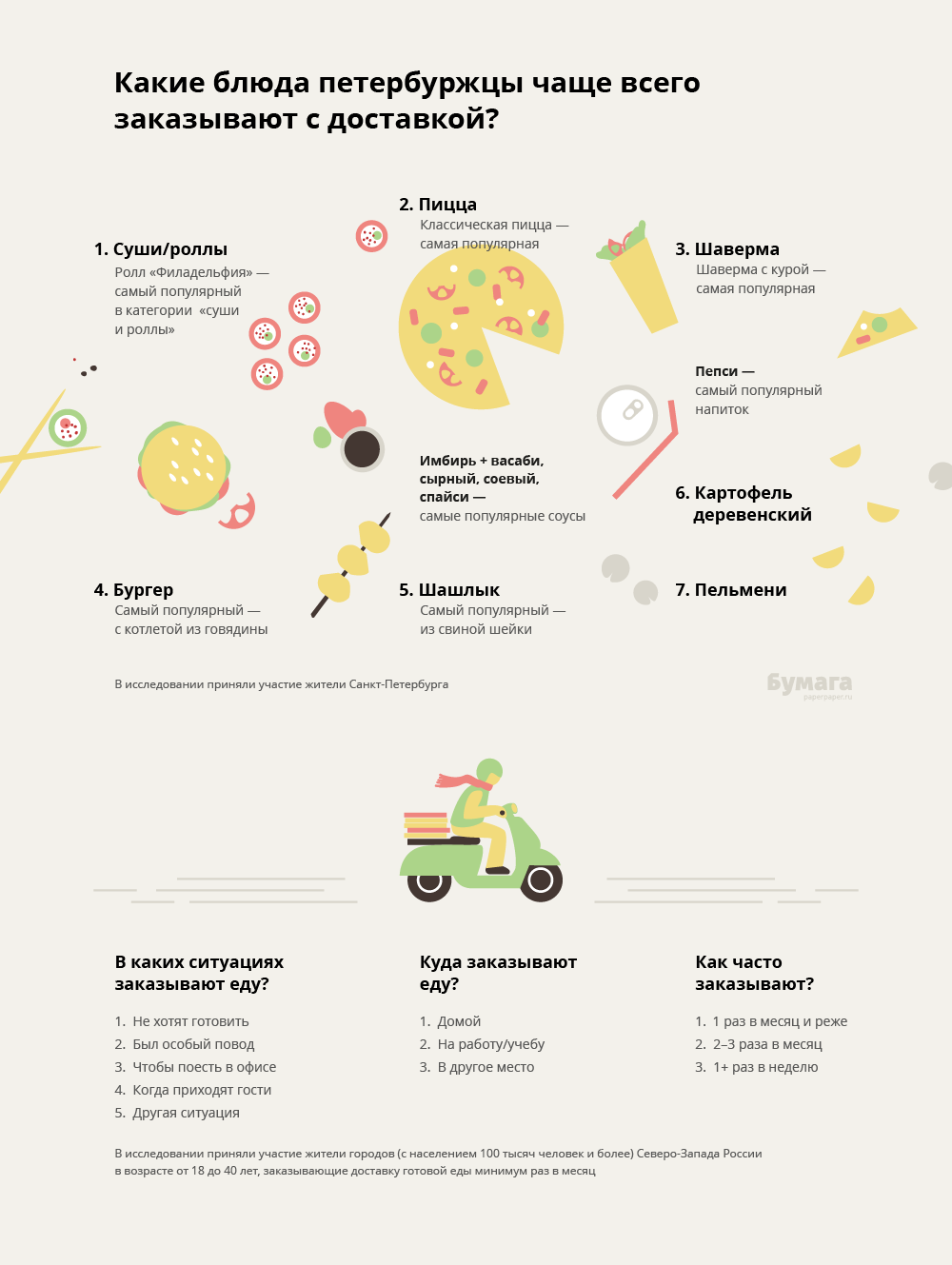 Роллы «Филадельфия» или пицца, бургер или шашлык? «Бумага» узнала, какую еду чаще всего заказывают петербуржцы, с каким соусом ее едят, какой напиток предпочитают и почему вообще выбирают готовые блюда — из-за лени или по особенному поводу.