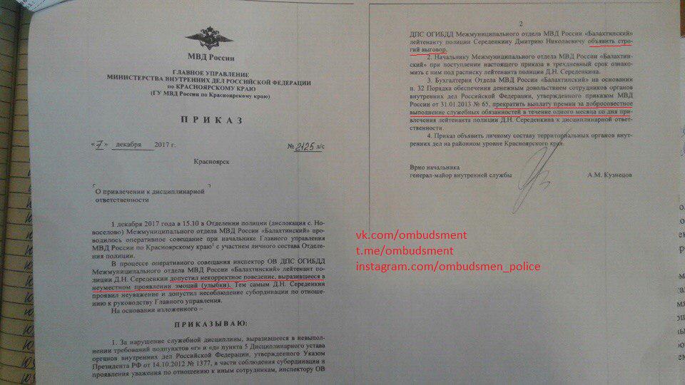 Ранее телеграм-канал «Омбудсмен полиции» опубликовал приказ о привлечении к дисциплинарной ответственности лейтенанта Д. Н. Середенкина, который «допустил некорректное поведение, выразившееся в неуместном проявлении эмоций (улыбка)».
