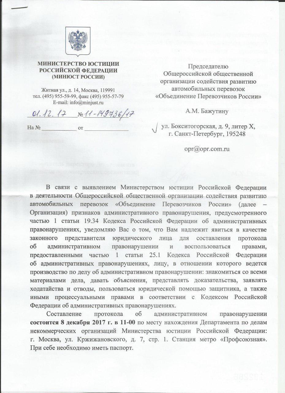 Минюст возбудил административное дело в отношении Объединения перевозчиков России. Документ опубликовал руководитель правозащитной организации «Агора» Павел Чиков. Дело возбуждено по статье 19.34 КоАП («Нарушение порядка деятельности некоммерческой организации, выполняющей функции иностранного агента»).