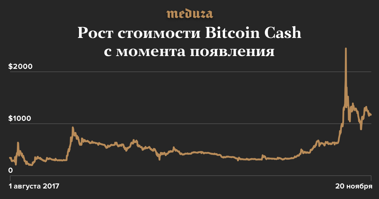 В начале ноября курс Bitcoin Cash резко вырос. Это произошло накануне внесения разработчиками изменений в алгоритм подсчета сложности майнинга новых блоков. На пике цена достигала 2400 долларов США — почти 0,4 обычного биткоина, но потом зафиксировалась в диапазоне 1200-1400 долларов.