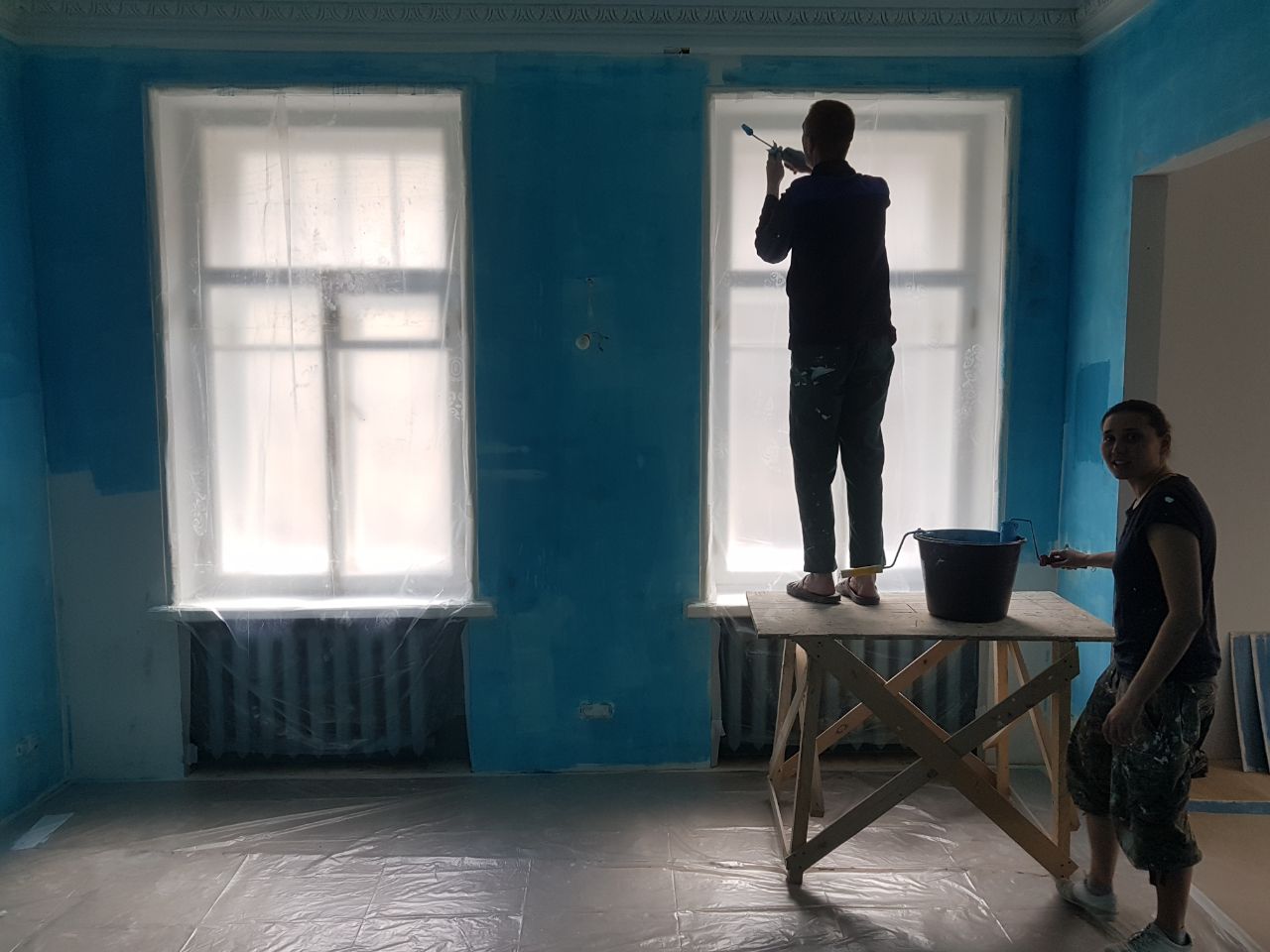 Команда — я и еще два человека, которые здесь работают. Мы занимаемся реставрацией кабинета, детской, прихожей, коридора, ванной и уборной; планируем восстановить кухню. На данный момент средства, затраченные на ремонт, составляют примерно 500 тысяч рублей.