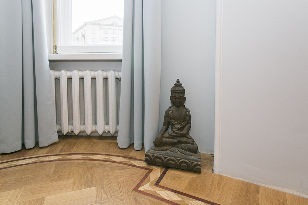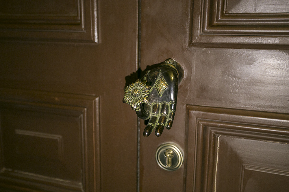 Моя квартира — половина изначальной, площадь которой была 220 метров. Из одной квартиры получилось две, соответственно, парадный вход вел в соседнюю квартиру. Мне же достался черный вход, [парадный] вход я делал дополнительно, согласовывал: дверь в квартиру — точная копия исторической, которая находится в квартире этажом выше. Мы создавали эту дверь с нуля. Здесь полностью воспроизводятся и филенки, и рисунок. Единственное — она дополнена ручкой, которую я привез из Непала: она символизирует руку Будды с цветком.