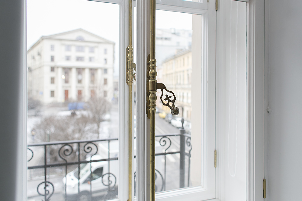 В квартире также восстановлены исторические окна: рамы сильно прогнили, нужно было заделать дыры. Кроме того, где-то окна покрашены (например, в гостиной), где-то — просто покрыты лаком. Сохранилась только часть исторических шпингалетов — но мне удалось найти точно такие же и везде поставить одинаковые. У балконов (в квартире их два — прим. «Бумаги») мы заменяли несущие балки, восстанавливали ковку.