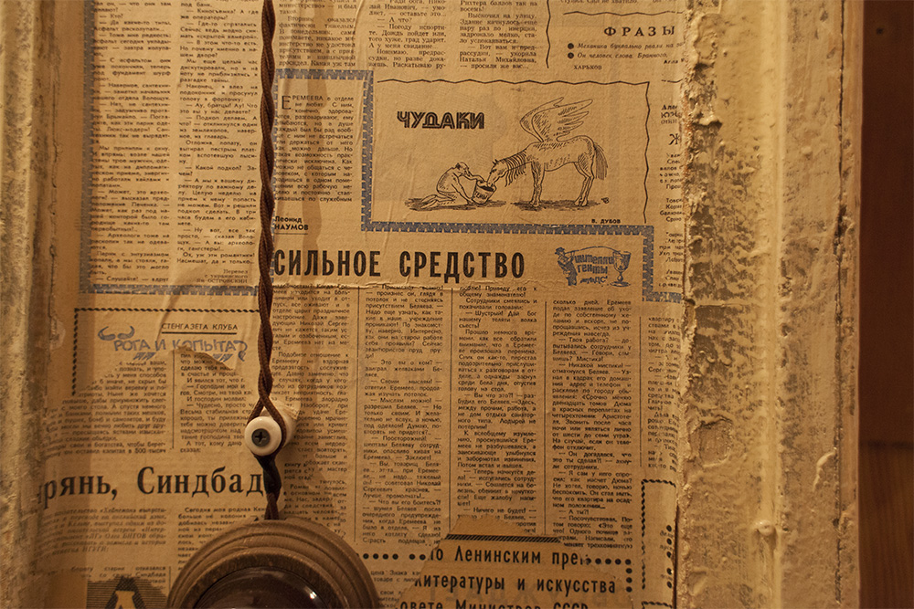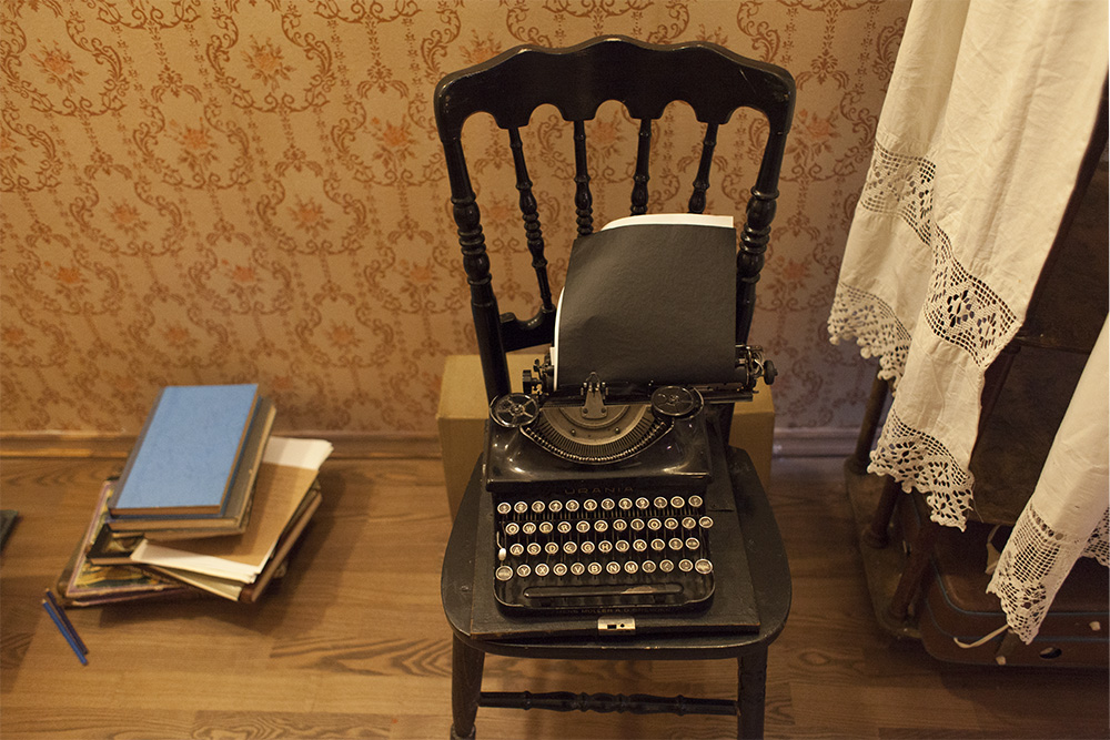 В квартире много пишущих машинок. Это и элементы декора, и театральный реквизит. Газеты, наклеенные на стены, — настоящие, старые, как и двери, которые мы специально подбирали. А стремянка стоит здесь всегда — она как бы говорит о незаконченном ремонте.