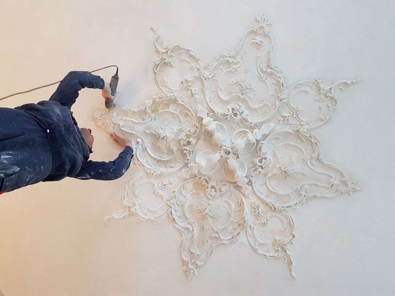 На кухне потолок полностью новый. Одна из центральных перегородок разделила фрагмент потолка с лепниной: центральная розетка была полностью залеплена, на потолке был просто небольшой бугор. Реставраторы вытащили два куска [лепнины]: край и середину. Так мы смоделировали весь потолок.