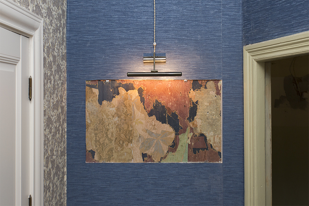 Под стеклом у нас хранится фрагмент исторических обоев. После войны здесь всё было перепланировано, поэтому это удача — когда мы находим что-то из дореволюционного времени: например, дверные ручки. Мы относимся к этому очень бережно, потому что это единственная оставшаяся связь с той эпохой.