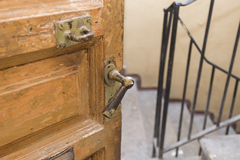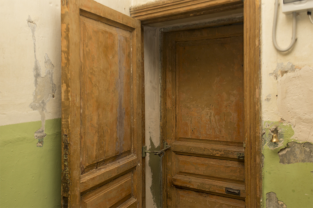 Окна были в ужасном состоянии, с трещинами на стеклах. Рамы и ручки на них подлинные — нам удалось их восстановить. Мы обнаружили замурованную дверь с покраской одним слоем на дереве — тоже тех времен. Дверей здесь много, и они все сохранились, но остальные перекрашены на много слоев и использовались в достаточно варварском режиме — в коммунальных квартирах никто особенно за такими вещами не следит.