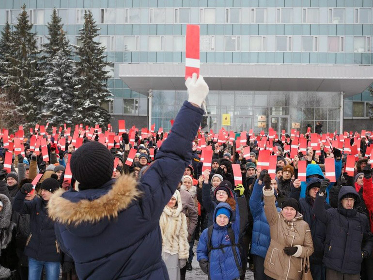 На вопросы положительно отвечают взмахом красных карточек свыше 950 человек (видимо, часть публики отсеялась из-за холода). Организатор собрания Бармин уже собирается объявить результат, но потом спохватывается: может, кто-то против? Кто воздержался? Таковых нет. Четверо ответили «против» только на последний вопрос — о закрытии собрания.