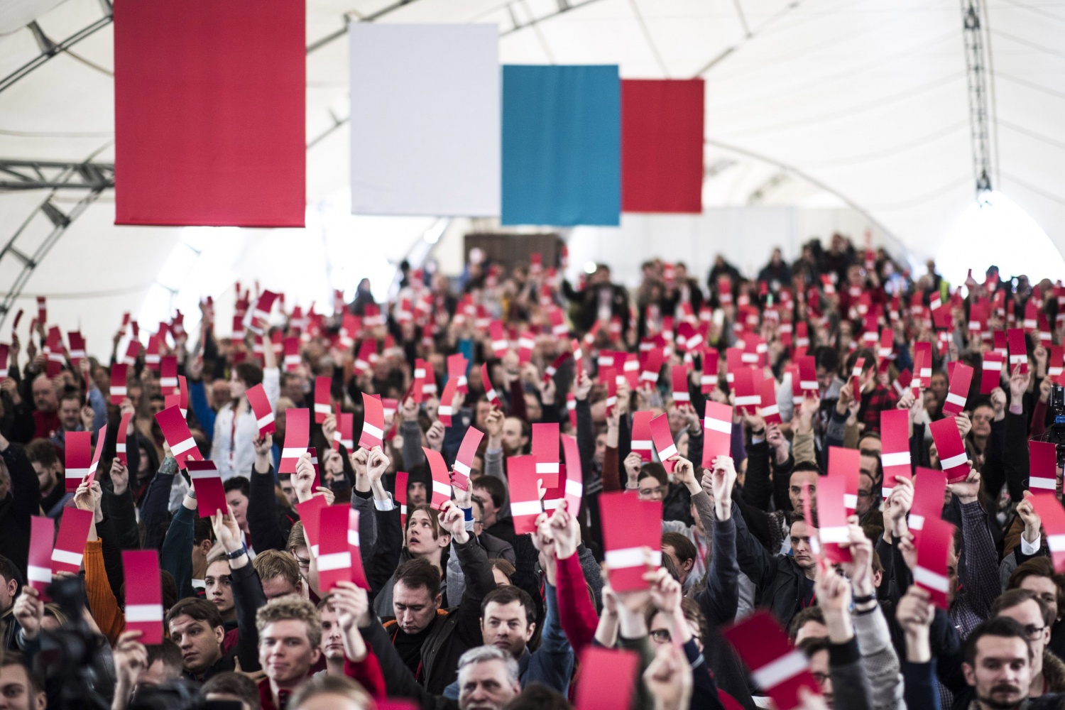 «Берем бейджик, он же мандат», — торжественно объявляли тем, кто получил 15-секундное свидание у нотариуса, а после — инструкцию. «Голосуйте только при помощи своих мандатов. Старайтесь поднимать мандат повыше и не опускать его, пока председатель комиссии не попросит вас этого сделать», — гласила инструкция. Толпа «делегатов» (причем не только молодых — было немало представителей старшего поколения) шли в огромный шатер как в зал для съезда.