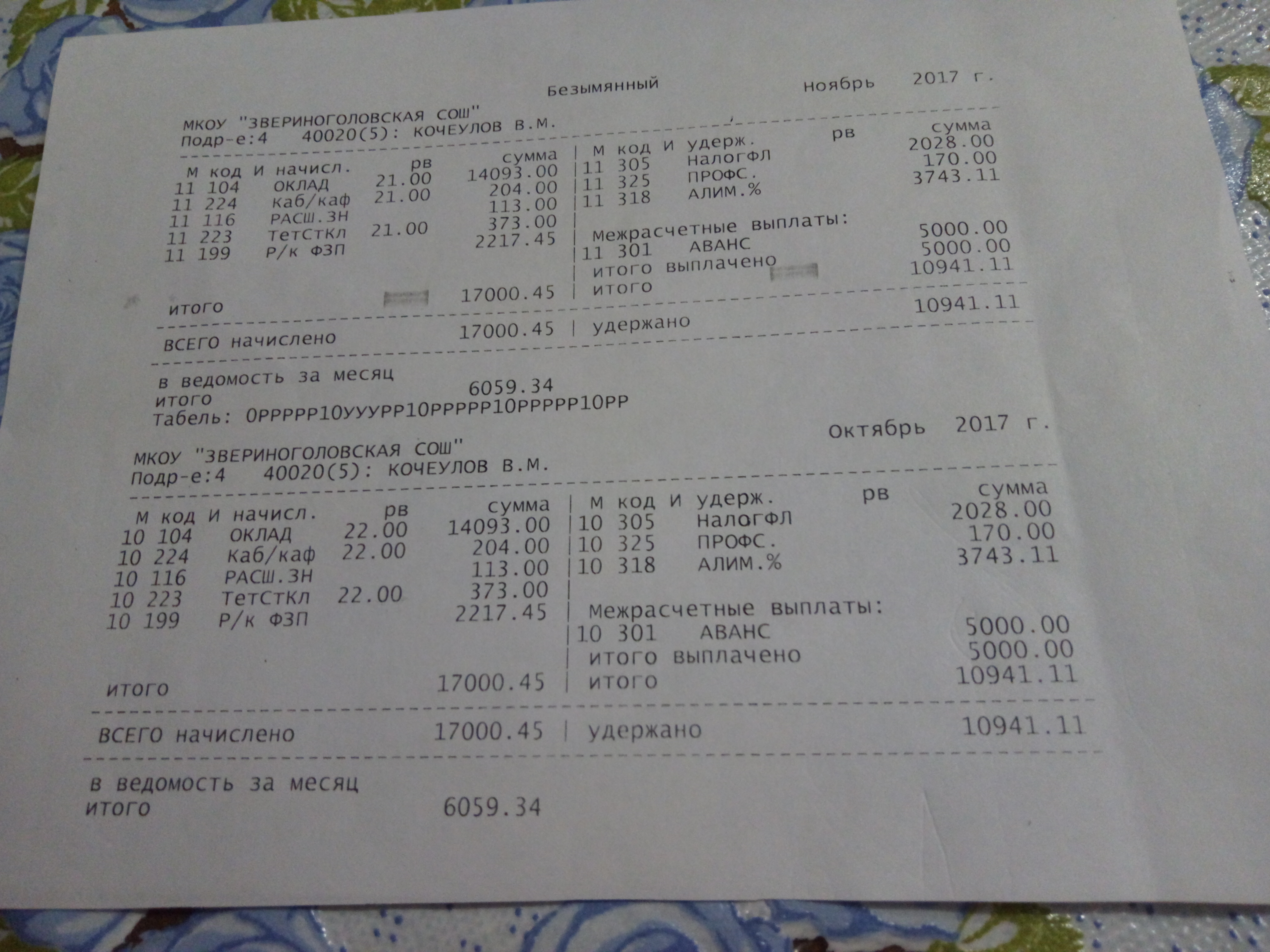 Его ученики лучше всех в районе сдают ЕГЭ и иногда выигрывают олимпиады. У Кочеулова 25-летний стаж работы учителем, 25 часов нагрузки в неделю (это полторы ставки) и зарплата 17 тысяч рублей, после вычета налогов на руках остается 14 700, вот и расчетный лист, если не верите.