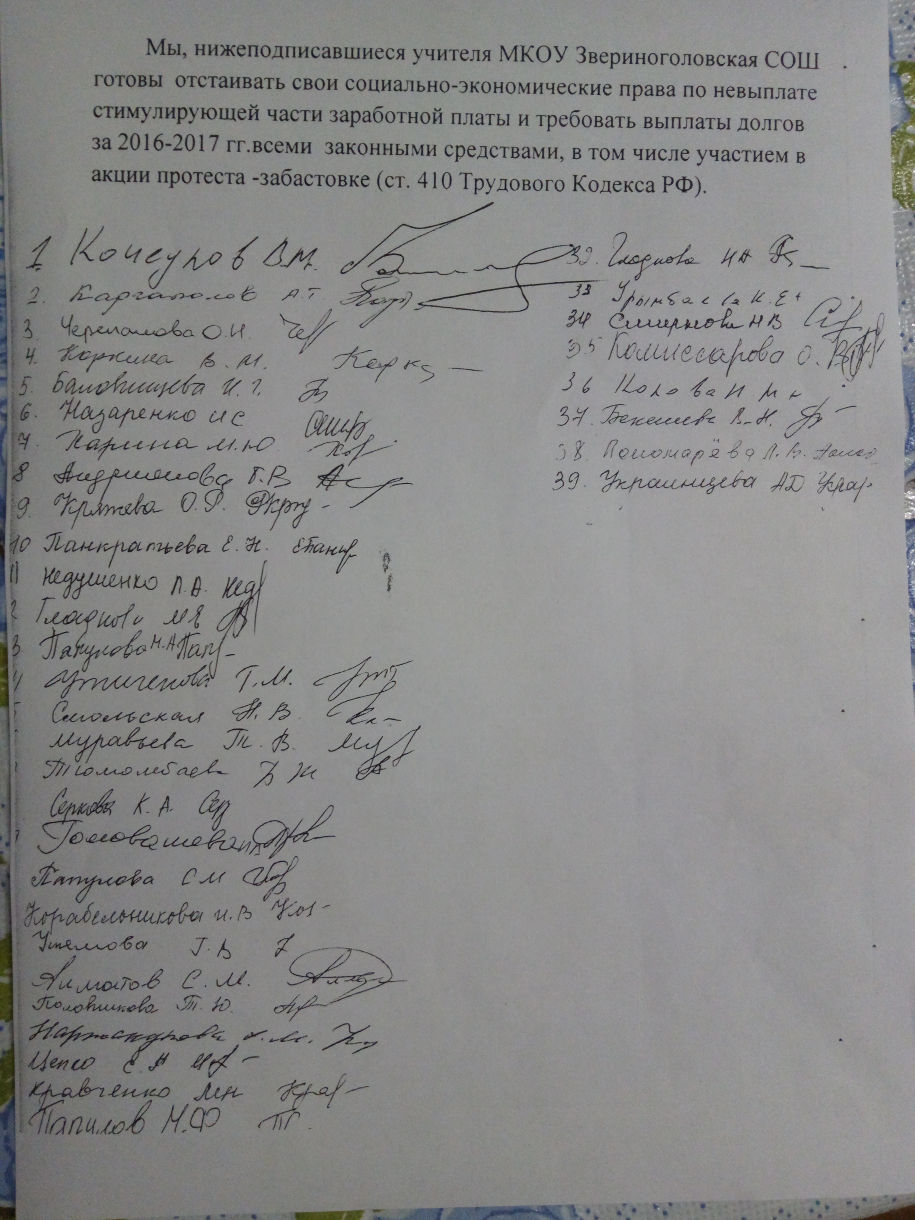 Учителя провели собрание, составили протокол, выбрали забастовочный комитет и заявили о своих требованиях: работодатель должен полностью погасить задолженность по заработной плате (стимулирующую часть) за 2016–2017 годы, с декабря 2017-го выплачивать стимулирующие ежемесячно, пересчитать отпускные. Под этими пунктами подписались 39 учителей из 42, работающих в Звериноголовской средней школе имени дважды Героя Советского Союза Г.П. Кравченко. Подавляющее большинство из них – вдовы или разведенки, которые в одиночку растят детей.
