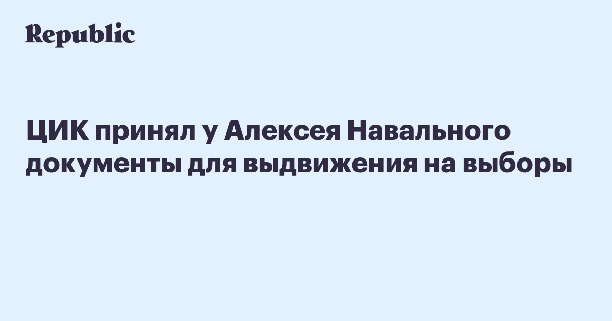 Центральная избирательная комиссия (ЦИК) вечером 24 декабря приняла документы оппозиционера Алексея Навального, необходимые для регистрации кандидата на выборах. Об этом в твиттере сообщил политик.