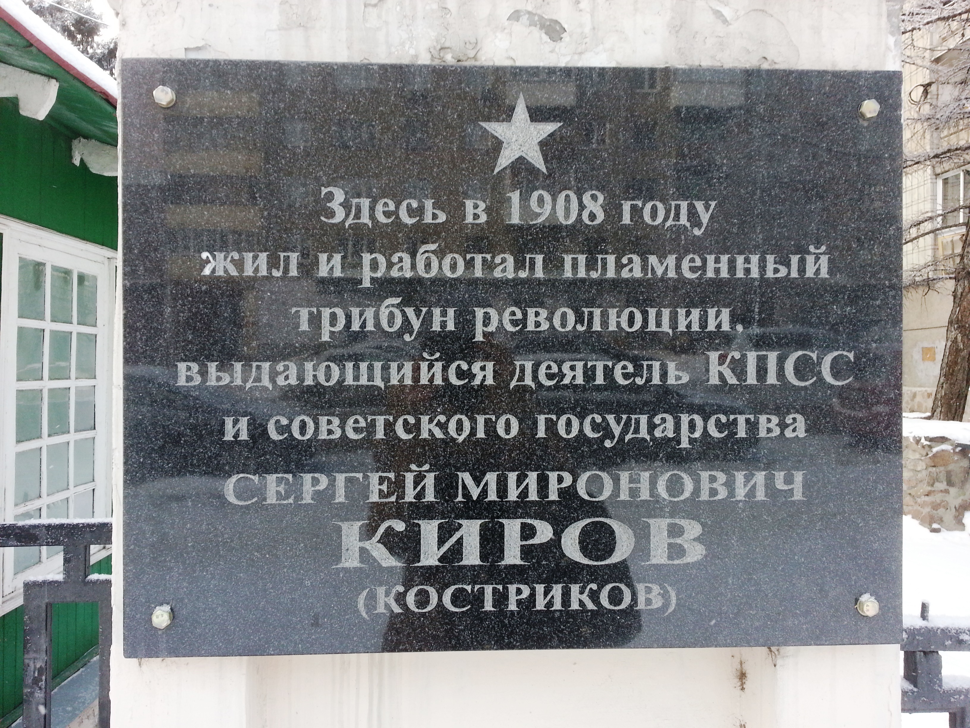 При этом у ворот дома по-прежнему висит большая мраморная доска, на которой начертано: "Здесь в 1908 году жил и работал пламенный трибун революции Сергей Миронович Киров".