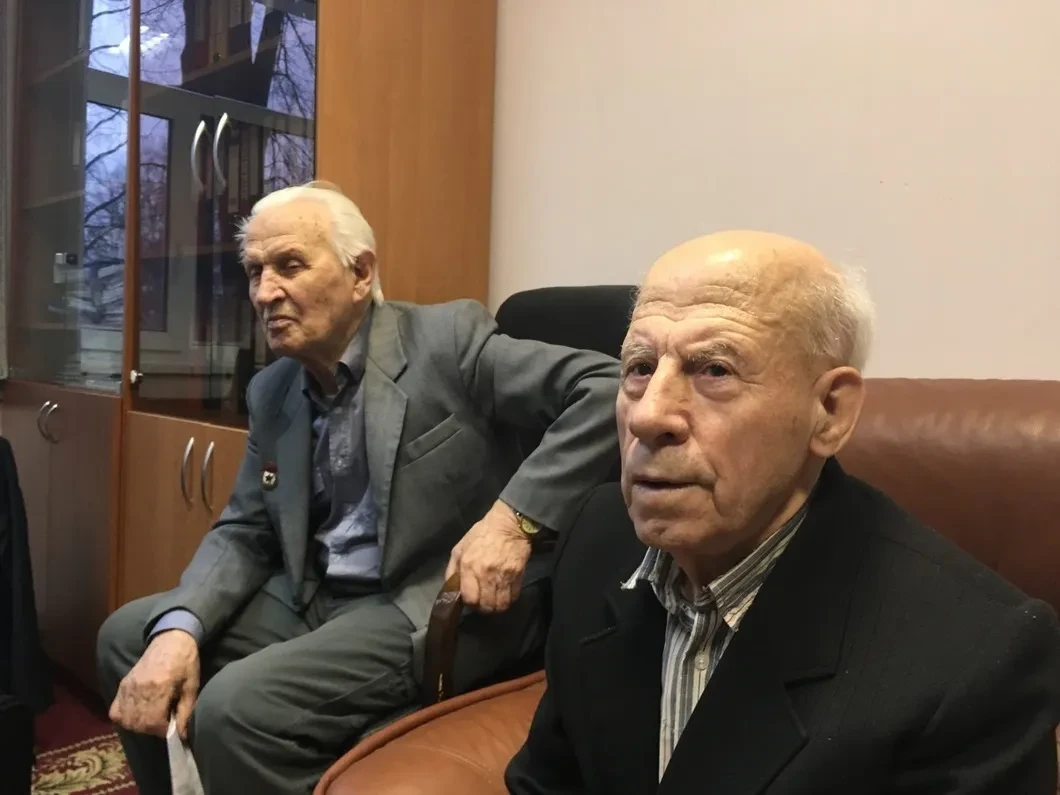 Наконец, 88-летний Дмецов с орденом Ленина на лацкане наклоняется к ветерану Великой Отечественной войны Николаю Бакинову: