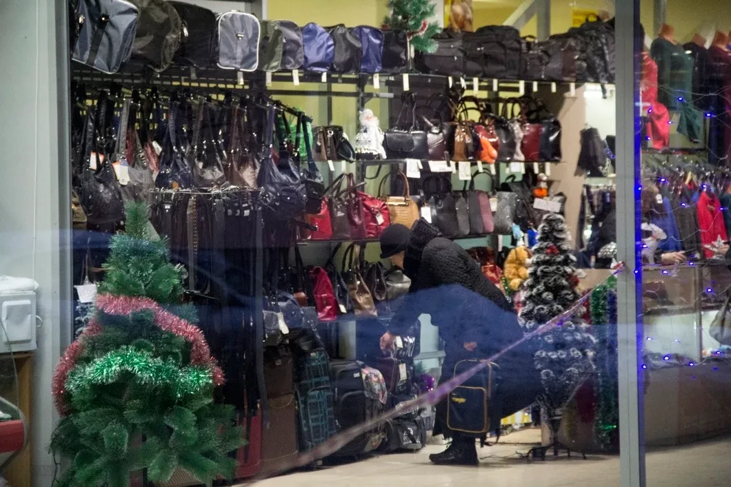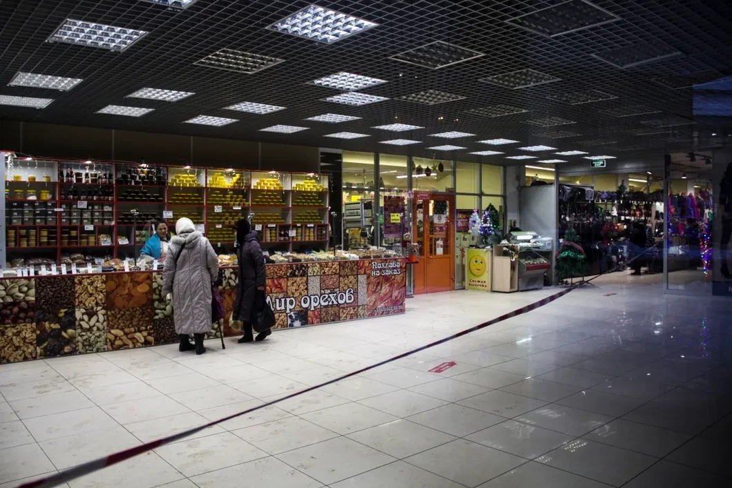Со стороны кажется, что «Невский пассаж» пустует. Из-за черных окон пристройка выглядит заброшенной. Свет только на входе, на двери надпись: «В отделе нижнего белья скидка 30% на бюстгальтеры», — за дверью торговые ряды прилегают к стене дома, противоположная часть пристройки огорожена красно-белой лентой, она пустует.