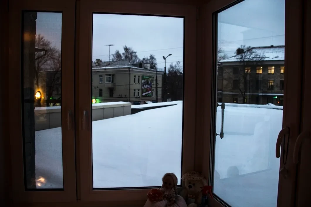 У Михаила Гошкиева просторная квартира, большая прихожая и кухня. В соседней маленькой комнате стоит портрет сына с черной лентой в углу. Рядом, на подоконнике, стопки бумаг — окно выходит на крышу «Невского пассажа», на синие сумеречные сугробы на ней.