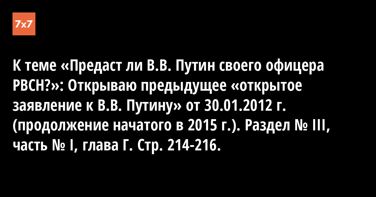 К теме «Предаст ли В.В. Путин своего офицера РВСН?»: Открываю предыдущее «открытое заявление к В.В. Путину» от 30.01.2012 г. (продолжение начатого в 2015 г.). Раздел № III, часть № I, глава Г. Стр. 214-216.