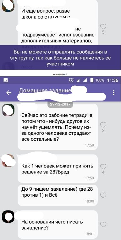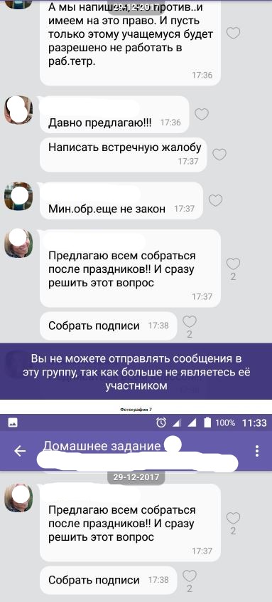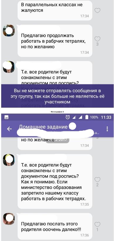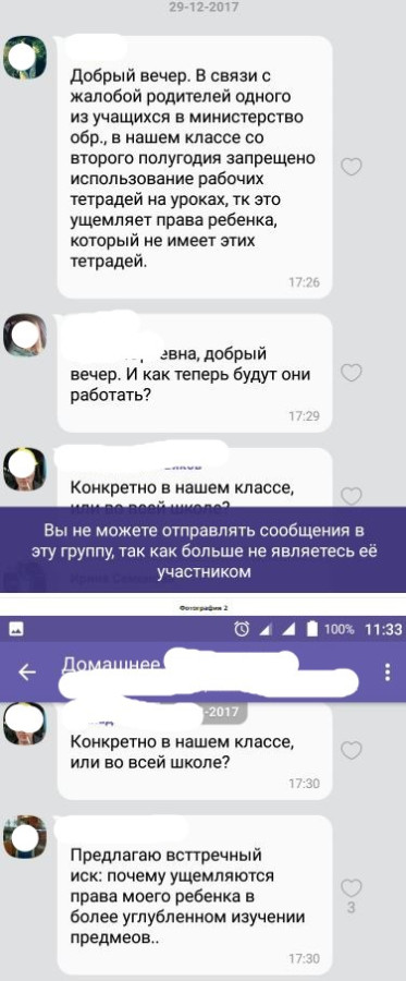— учитель психанула и вывалила на родителей, что «одна из нас, не буду показывать пальцем» всё-таки добилась того, чтобы рабочие тетради у нас запретили