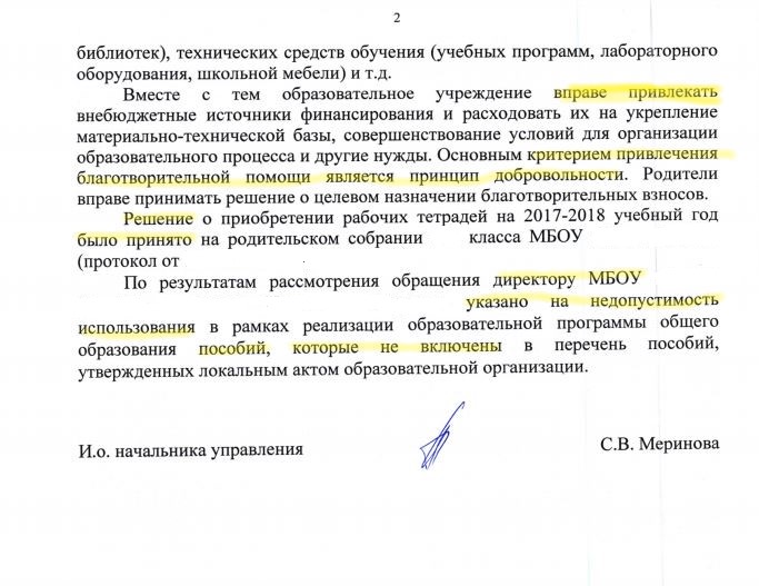 Отмечу отправной посыл предыдущего скрина: «в связи с жалобой родителей одного из учащихся», а не согласно письму С.В. Мериновой — и.о. начальника управления образования и молодежной политики Рязани.