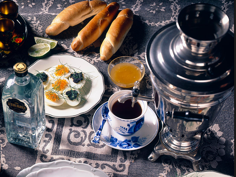 Но вот чудо: кухня, которую русские считают своей, красивее итальянской. Белая Гурьевская каша с медом, пышные пирожки из белой пшеничной муки с лесными ягодами, громадные кулебяки с курятиной, щи из кислой капусты с говядиной, печеные судаки и лещи, печеная репа с медом, вареные пельмени.