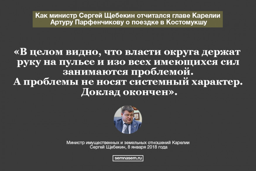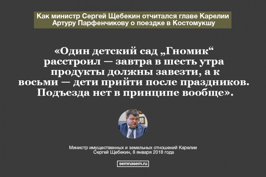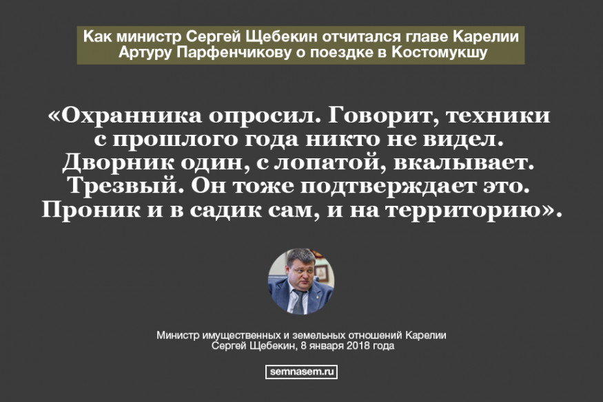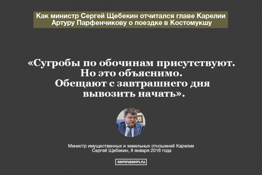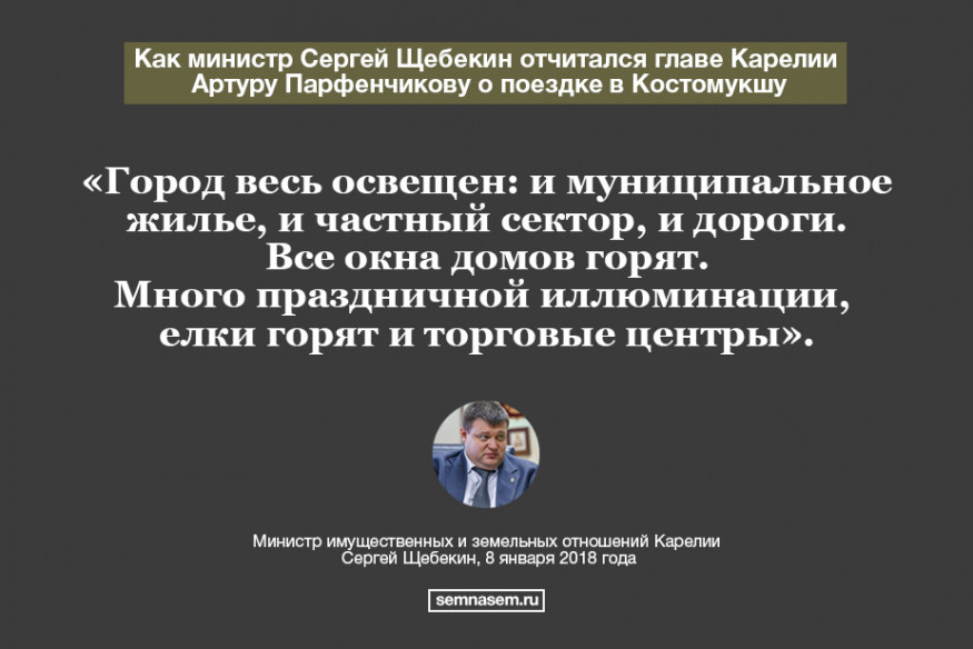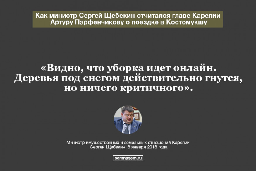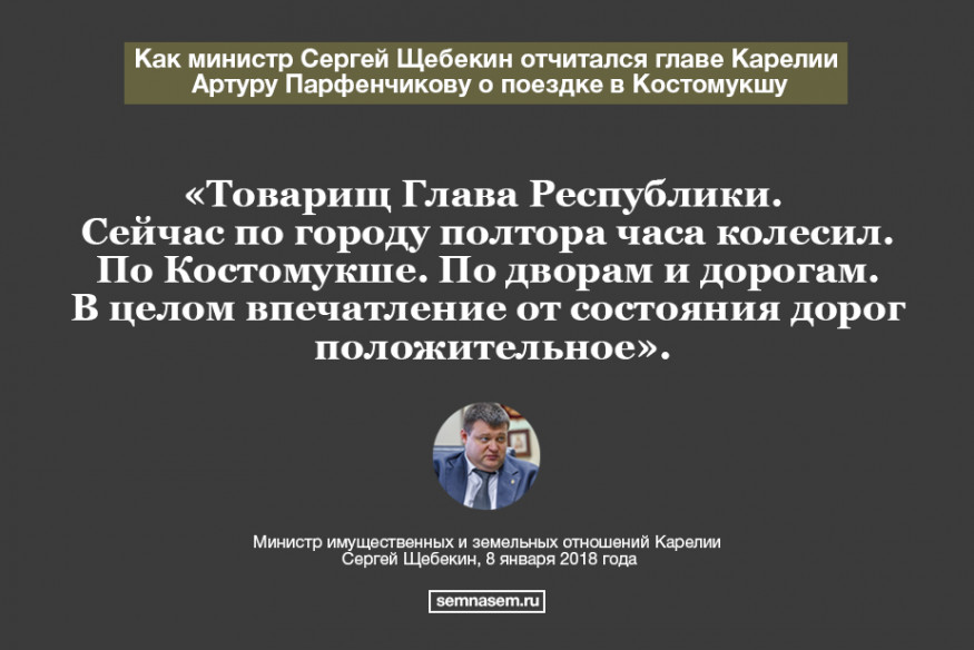 Министр имущественных и земельных отношений Карелии Сергей Щебекин 8 января написал главе Карелии Артуру Парфенчикову отчет о поездке в город Костомукша. Тот разместил текст на своей странице во «ВКонтакте». За сутки пост с отчетом министра набрал около 10 тысяч просмотров.