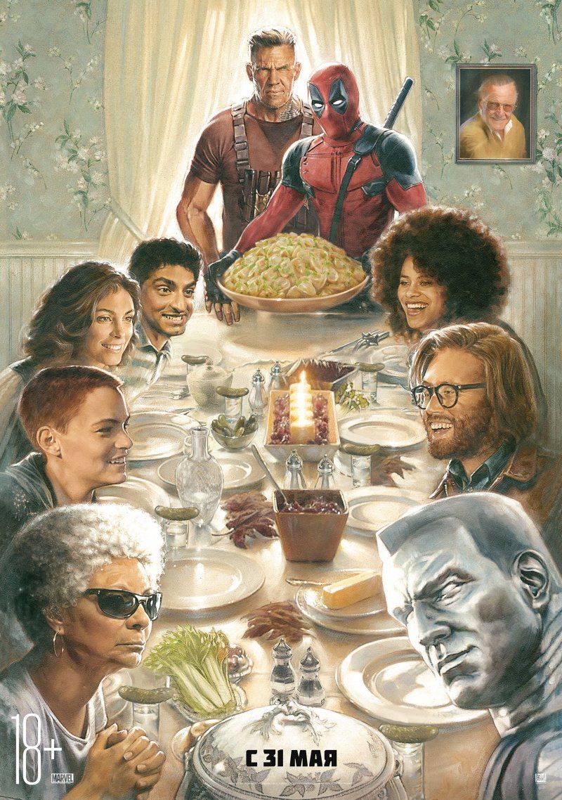 Пользователи соцсетей обнаружили, что студия 20th Century Fox выпустила российскую версию постера «Дэдпула 2» — с пельменями и рюмками, на которых лежат огурцы.
