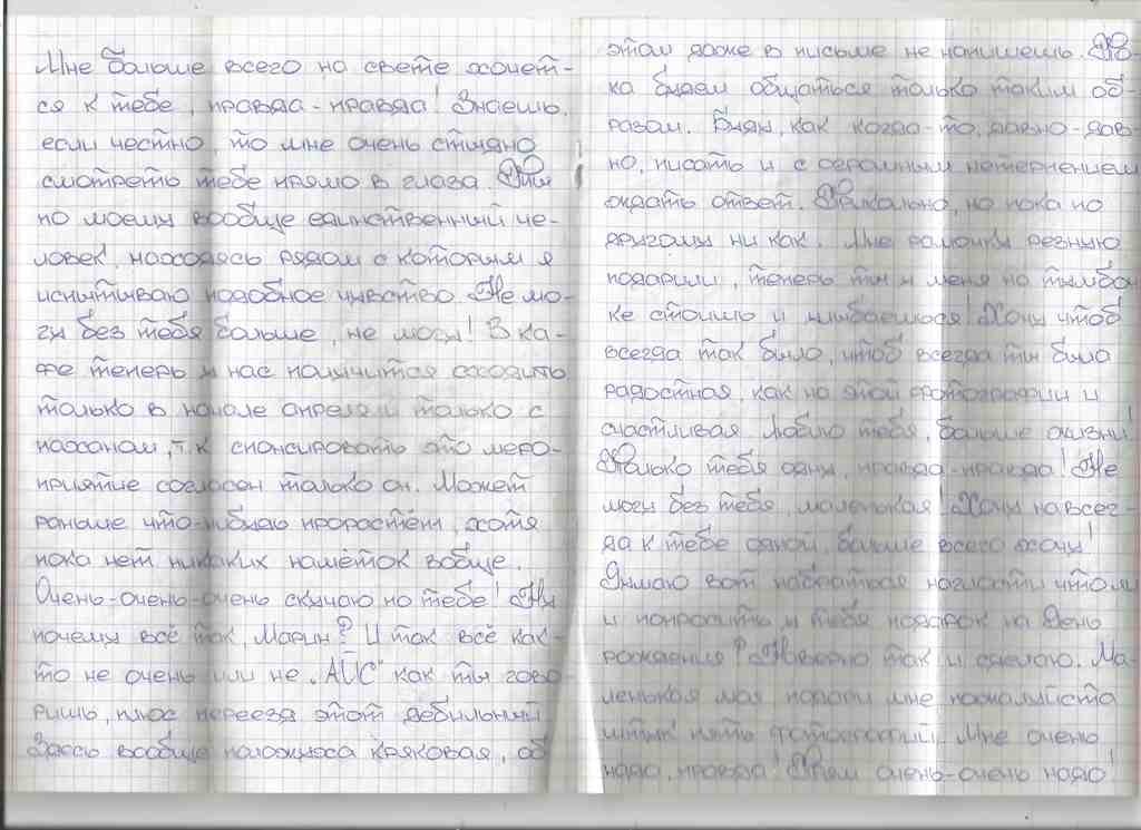 Когда Марина попала в больницу, и ей вырезали яичник, ее парень «с воли» расстался с ней со словами «а чего с тобой делать теперь, раз у тебя яичника нет». Иван же звонил каждый день и успокаивал, а в конце концов подарил кольцо, чтобы не расстраивалась. «Пришел родственник кого-то, кто вместе с ним сидел, мы сходили в ювелирный магазин, я выбрала кольцо, и Ваня его оплатил. Кольцо было не единственным подарком. Он дарил мне цепочку, золотой браслет и перед Новым годом, когда еще не знал, что его осудят, подарил шубу. У него были деньги. Параллельно звонкам он стал писать мне письма, — говорит Марина. — После кольца я начала ходить на его суды».