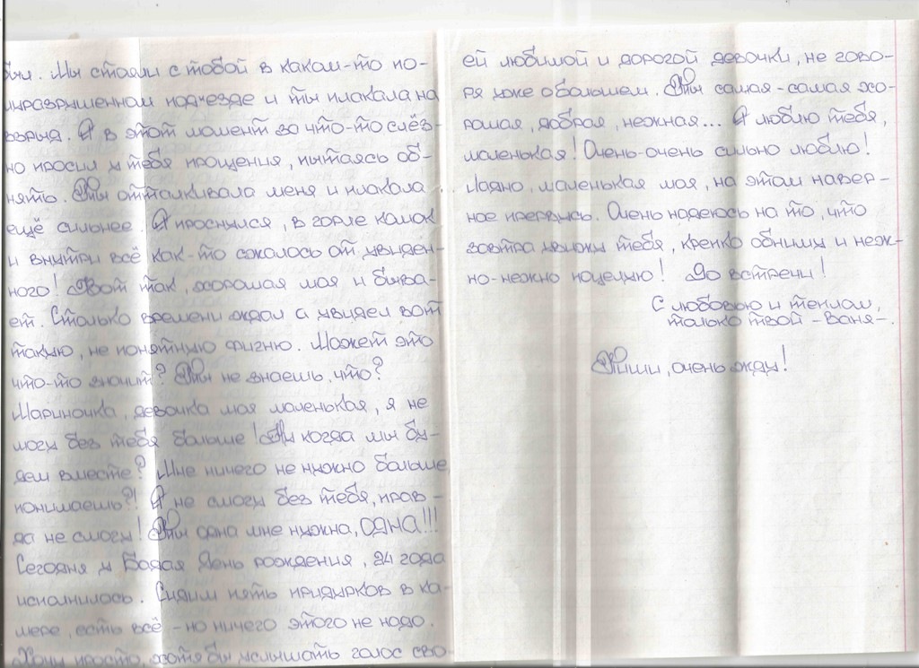 «Мы не ссорились: ни когда он сидел, ни когда вышел. До Вани я была глубоко разочарована в мужчинах. Всех, кто был до него, интересовали другие аспекты жизни: вкусно ли я готовлю, можно ли у меня занять денег, можно ли зайти по***ться (заняться сексом — прим. Тайги.инфо)? Что я думаю — это никого не волновало, — сокрушается Марина. — А он меня слышал, понимал, любил, мне было, с кем поговорить, поэтому меня не волновало, что будет потом».