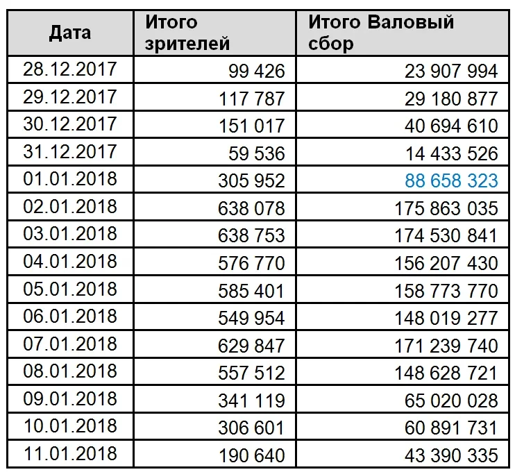 Но помимо широко развернутой рекламной кампании, важен «сарафан». Если за первые пять дней — начиная с 28 декабря — сборы фильма составляли 196 875 330 руб., то только 2 января фильм посмотрело 638 078 зрителей, а сборы составили 175 863 035 руб. По опросам 75% зрителей ставили картину высокую оценку. Благожелательно приняла картину и отечественная критика.