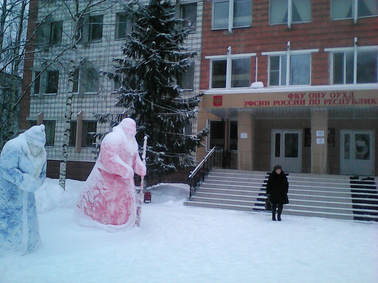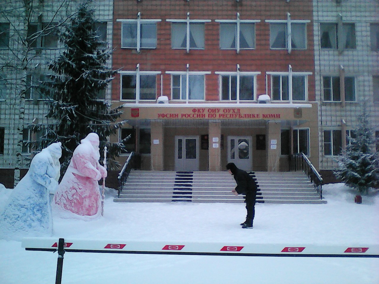 Неподалеку стоит здание УФСИНа по Коми. Крыльцо почищено, а рядом из снега слеплены Дедушка Мороз и внученька Снегурочка. Однако по необъяснимой логике они почему-то кланяются. Наверное, начальству УФСИНа, которое идет на работу.