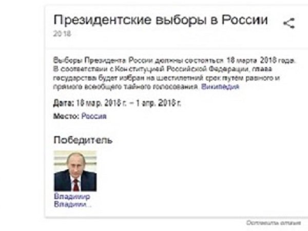 Если ввести в поисковую строку запрос о выборах-2018, появлялся виджет, с портретом Владимира Путина и подписью победитель. Отмечается, что подобное происходило в том числе при введении запроса на английском языке.