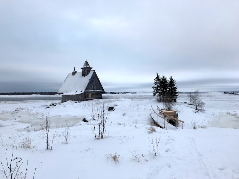 Декорации фильма "Остров" зимой выглядят также, как и летом - странная избушка на мысу…