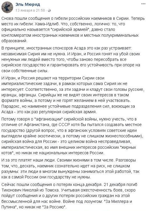 «Снова пошли сообщения о гибели российских наемников в Сирии, — пишет Эль Мюрид. — Теперь место их гибели: Хама-Идлиб. Что, собственно, логично: то, что официально называется «сирийской армией», давно стало конгломератом иностранных наемников и местных полукриминальных образований. В принципе, иностранных спонсоров Асада это как раз устраивает: независимая Сирия им не нужна. И Иран, и Россия гонят на убой своих ненужных им людей вместо того, чтобы заново пересобрать все сирийское государство и гарантировать его устойчивость при опоре на свои собственные силы.<...> И за это платят наши люди. Своими жизнями в том числе. Разговоры том, что, дескать, наемник сознательно идет на риск, не слишком разумны: эти люди в многом вынуждены заниматься этой работой, так как в самой России они государству не нужны. Сейчас пошли сообщения о потерях конца декабря. 21 декабря погиб Тихонович Николай из Томска. Учитывая ожесточенность боев, скоро пойдут сообщения и о других потерях российских граждан на этой бессмысленной для нас войне».