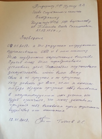 В заявлении Титиев сообщает, что в его машину было подброшено наркотическое вещество, а дело сфабриковано. Доказательства вины подтасованы.