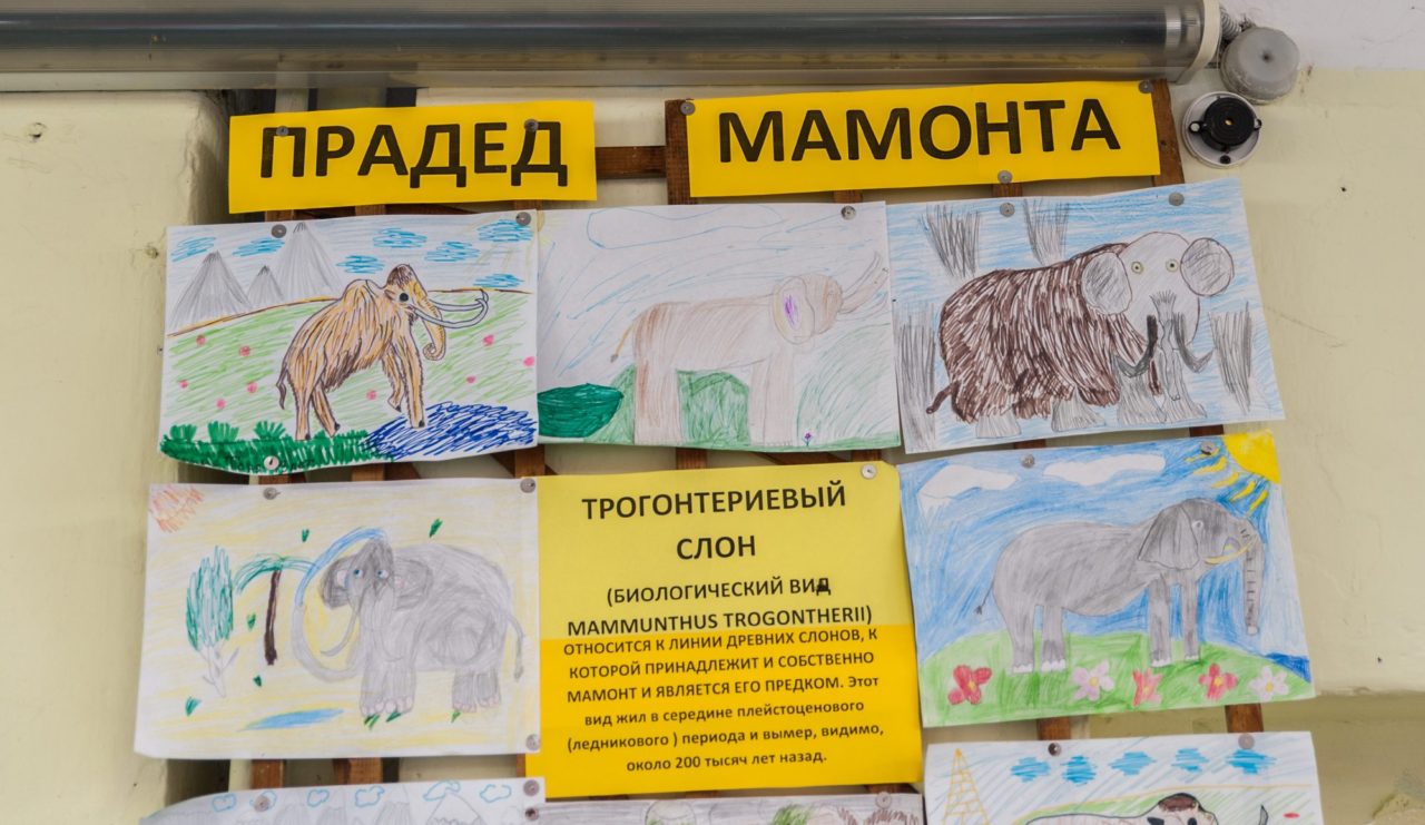 «С тех пор как началась вся эта история со слоном, мы с детьми стараемся делать что-то, с ним связанное — стараемся, чтобы слон так или иначе фигурировал в наших работах», — говорит она, показывая выставку детских рисунков «Прадед мамонта».