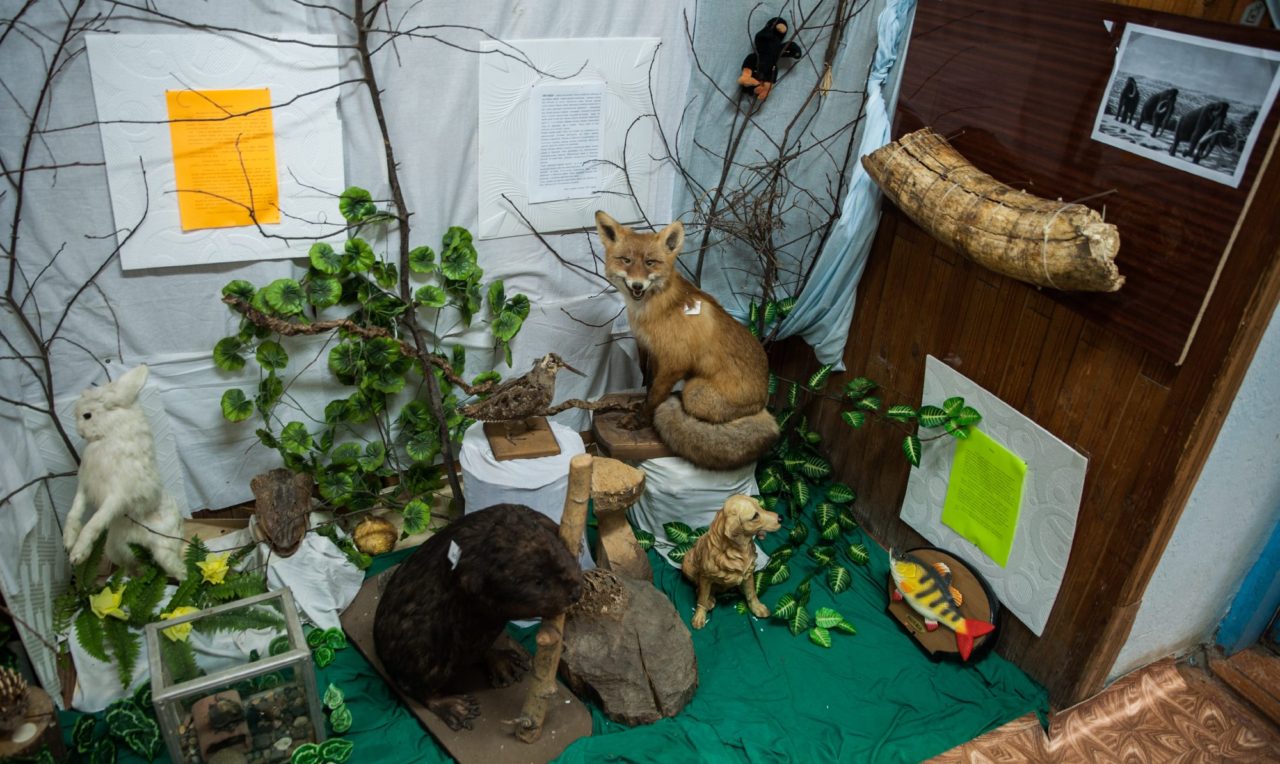 В музееФото: Иван Козлов В соседнем зале — экспозиция, посвященная природе окрестных лесов. Она состоит из чучел животных вперемешку с мягкими игрушками. Еще в ней представлена электрическая поющая рыба — сувенирная рыбина на доске бьет хвостом и истошно вопит, когда ее включаешь. Центральный экспонат выставки — большой фрагмент того самого бивня слона, с которого все и началось. Он прижат пластиковыми стяжками к лакированному куску ДСП.