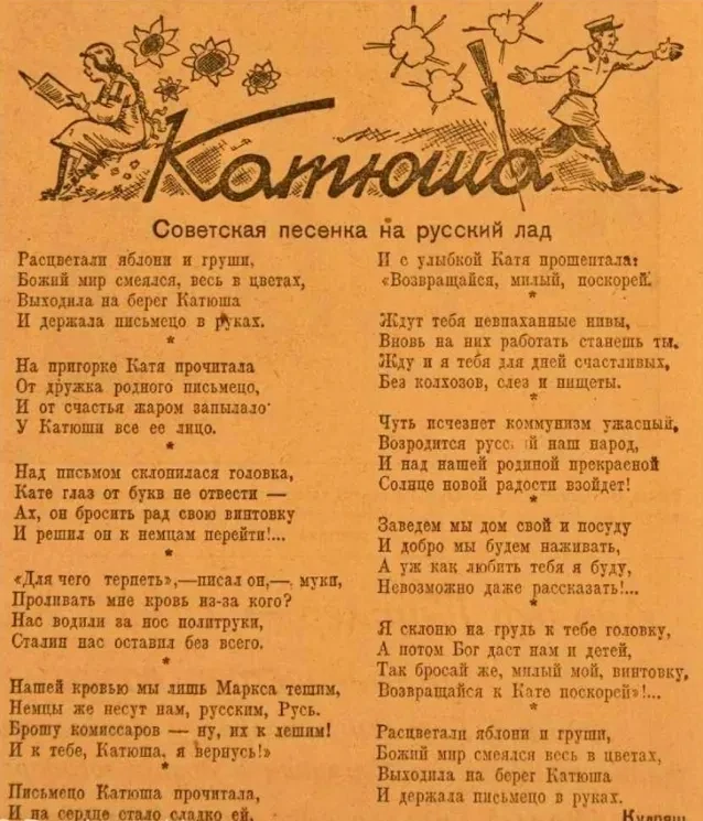 В моей коллекции есть немецкие листовки с антисоветским текстом «Катюши»: «Нашей кровью мы лишь Маркса тешим. Немцы же несут нам, русским, Русь. Брошу комиссаров — ну их к лешим. И к тебе, Катюша, я вернусь». То есть противопоставляется русское и советское. В этом и была ошибка немецких пропагандистов.