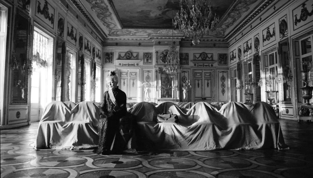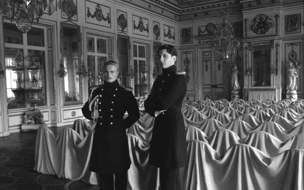 Все начинается в дворцовом зале с креслами, накрытыми белыми чехлами, словно бледные воспоминания об истаивающем прошлом с балами при свечах. Весь фильм — попытка реинкарнации этого бесследно канувшего в воды забвения мира.