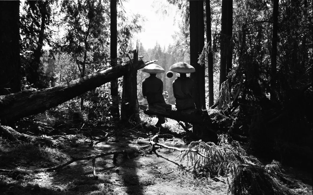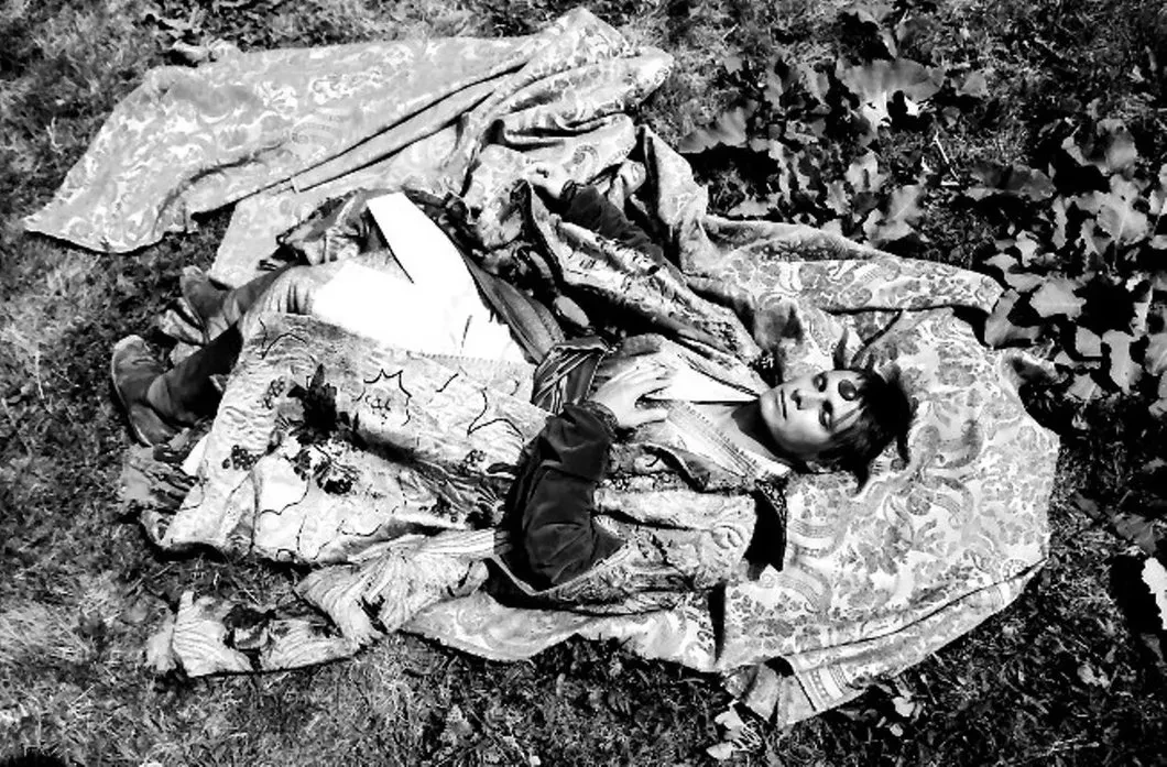 Чтица, утянутая в черное платье, ублажает слух князя даже не самой историей, но волшебством происходящего, предстающего перед нами воочию (подчас как в немом кино — без звука). В берендеевом лесу неведомыми дорожками мчат васнецовские царевич с царевной в дорогом хамдамовском убранстве, в чаще сверкает волшебное зеркальце, привязанного к дереву царевича пронзит стрела, как Святого Себастьяна. А над гладью билибинского озера — голове разбойника, на которой замрет меч, и сама вода выстроит симметрию неотвержимого предвестья преступления. Здесь люди-грибы с соломенными ранцами находят клад и не знают, что с ним делать. А Баба-яга (неузнаваемая Алла Демидова) колдует и режиссирует действие.